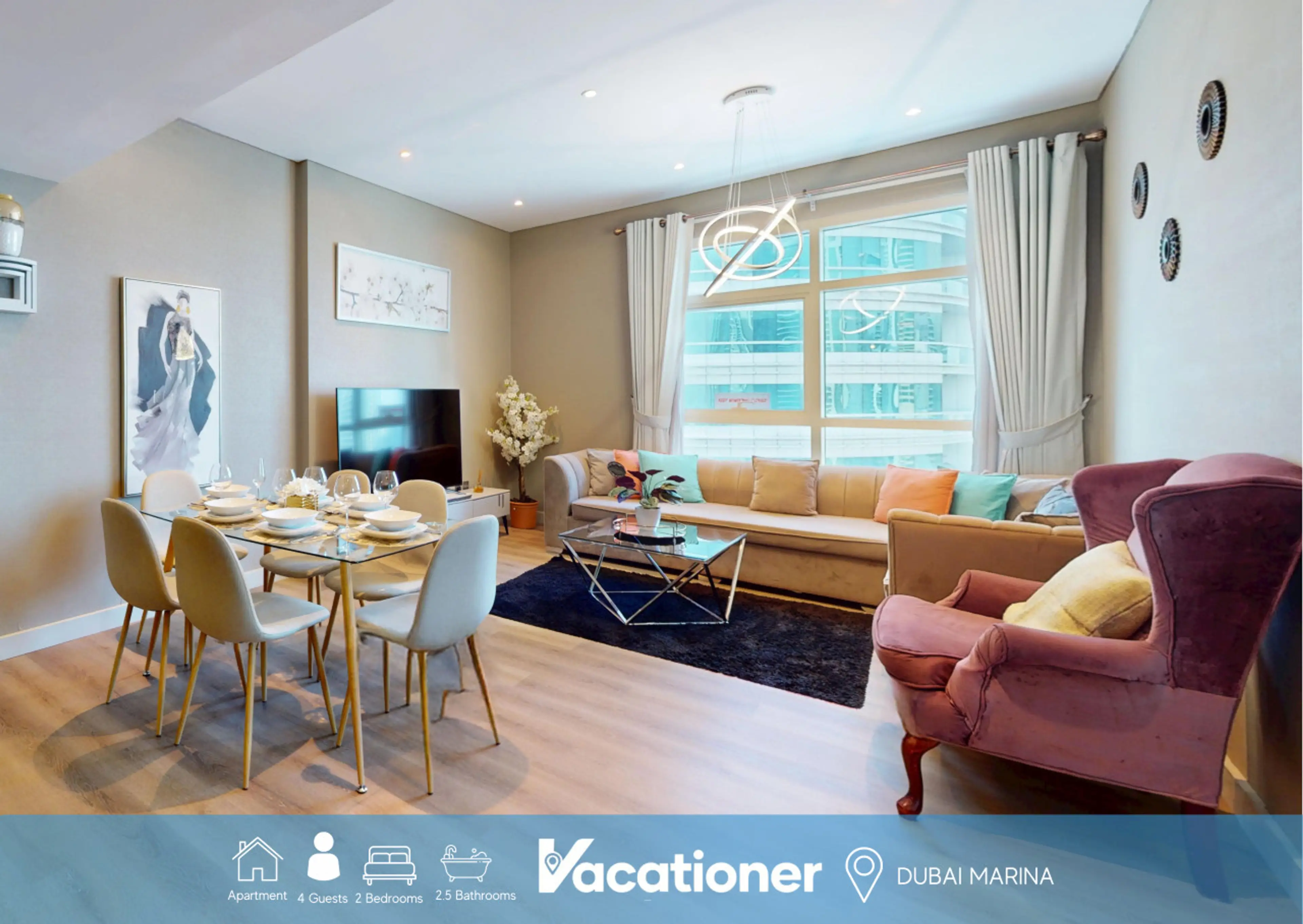 Welcome to this vibrant two-bedroom apartment, located in the heart of Dubai Marina. This stylish home features thoughtful decorative touches throughout and has large windows, creating a calm and relaxing atmosphere. Guests can fully immerse themselves in marina living, with a wide array of dining, ...